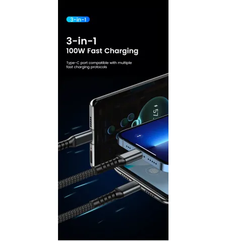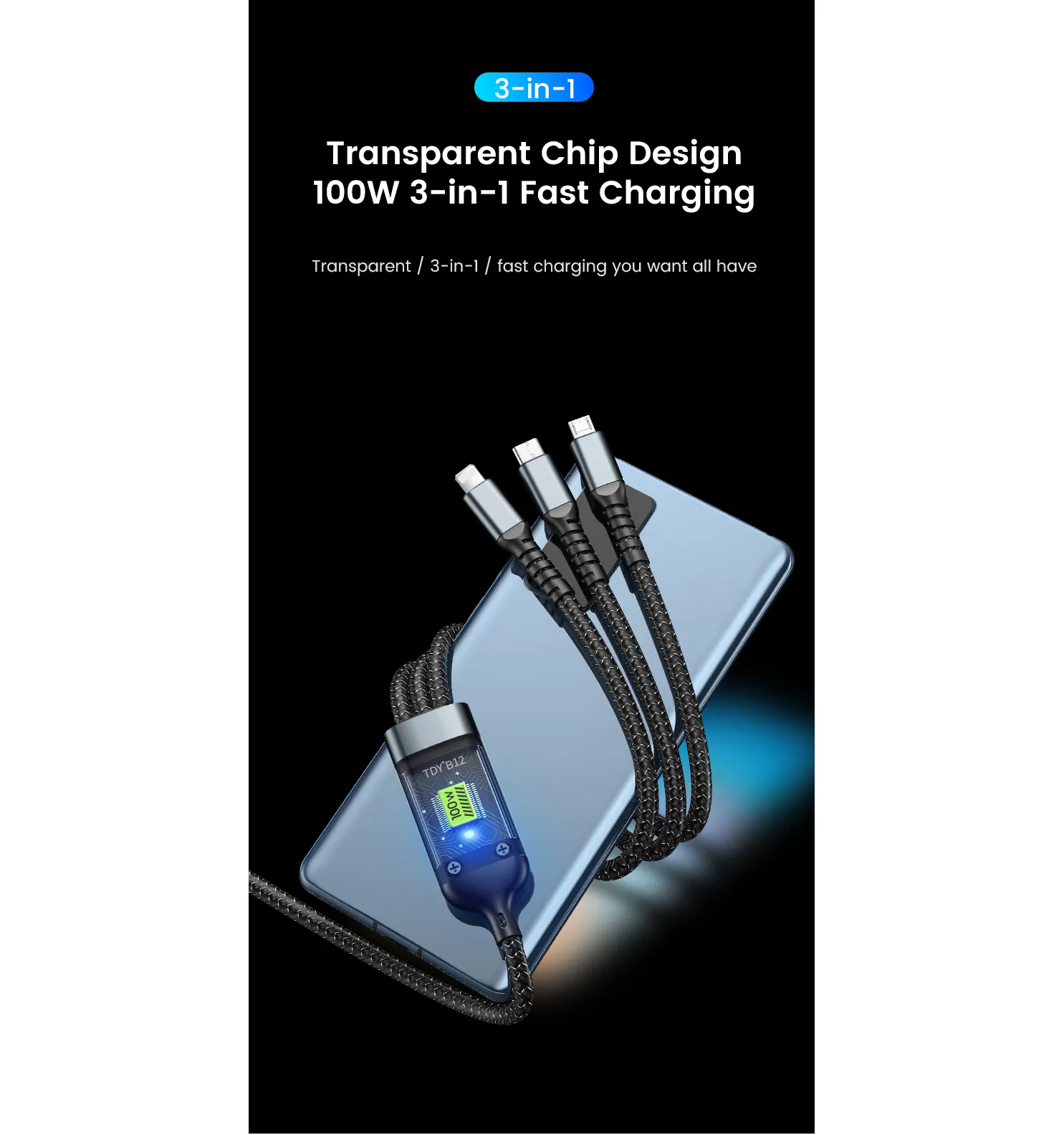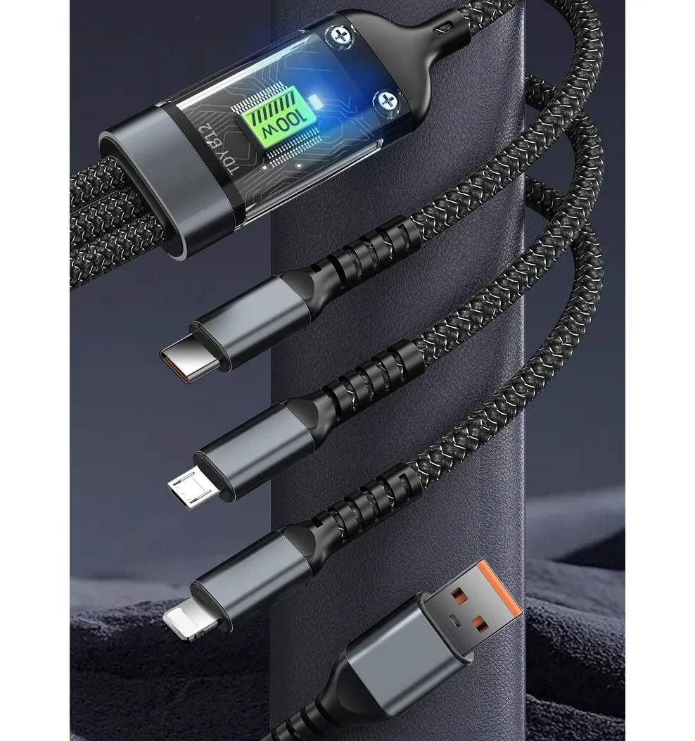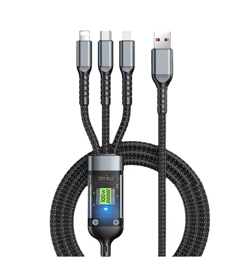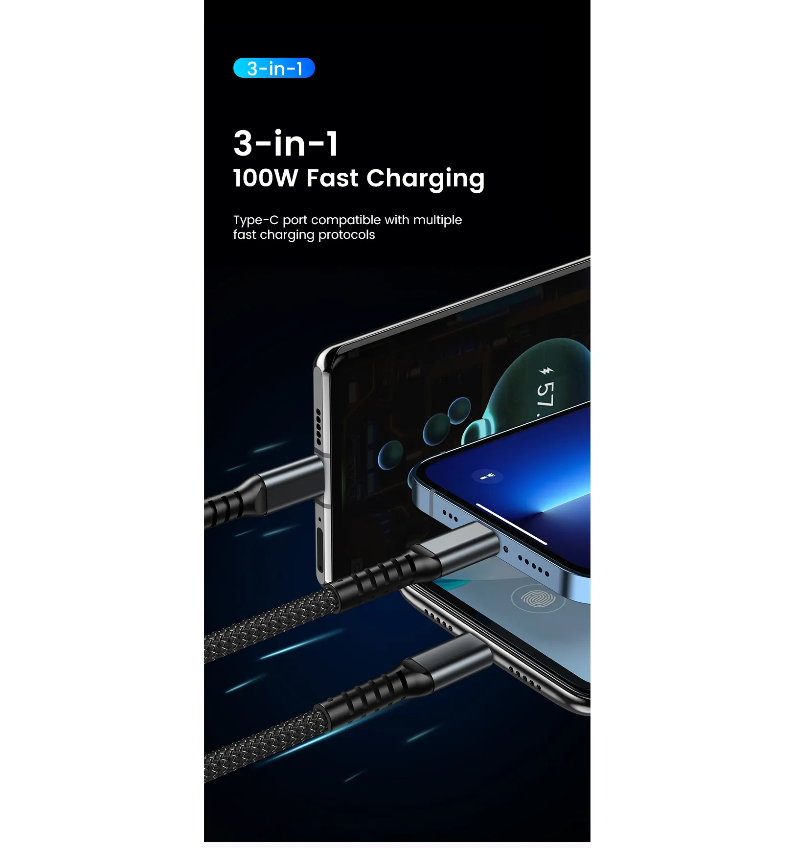 3-in-1 USB 100W Fast Charging Cable | Type-C + Lightning + Micro USB | High-Speed Data Sync | 1.2 Meter | Universal Charging Cable