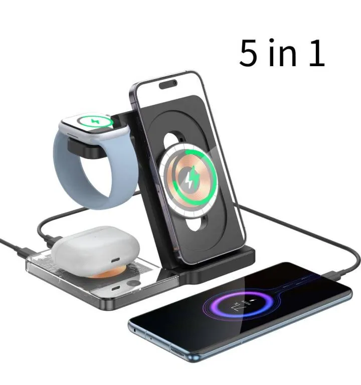 The 5-in-1 Fast Wireless Charger Stand is a foldable, magnetic charging solution that supports multiple devices simultaneously, offering quick, efficient charging for phones, smartwatches, and earbuds in one compact stand.
