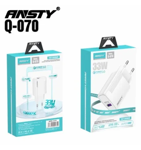 Supports quick charge 3.0 up to 33W, outputs 5V/9V/12V at up to 3A, USB‑A output (or USB‑C depending on variant), built‑in protections, compact wall‑plug design.