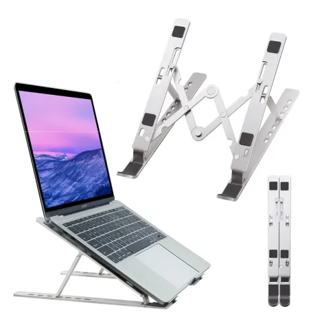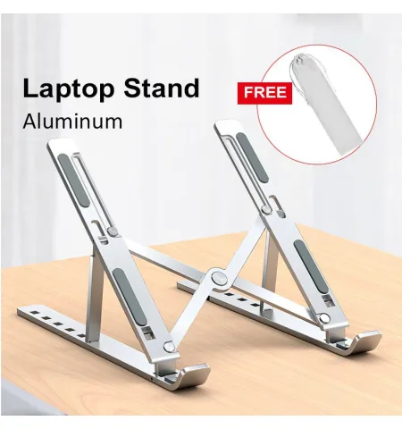 Aluminium Alloy Adjustable Laptop/Tablet Stand (Silver) for 10–17" devices. Raises your screen by ~6–7 inches with 7 angle positions for ergonomic comfort. Lightweight (225 g), foldable for easy storage, and built with plastic + aluminum alloy. Size: 240×160×69–118 mm. Static load ~30 kg (recommended 15–20 kg). Supplied in color box.