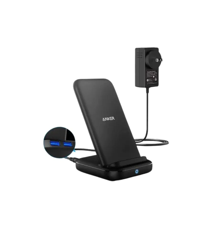 Anker’s PowerWave 10 Station delivers fast 10 W wireless charging for Samsung, 7.5 W for iPhone, and 5 W for other Qi‑enabled devices, plus two USB‑A ports (12 W total). Its dual‑coil stand supports horizontal or vertical placement and charges through most cases (< 5 mm).