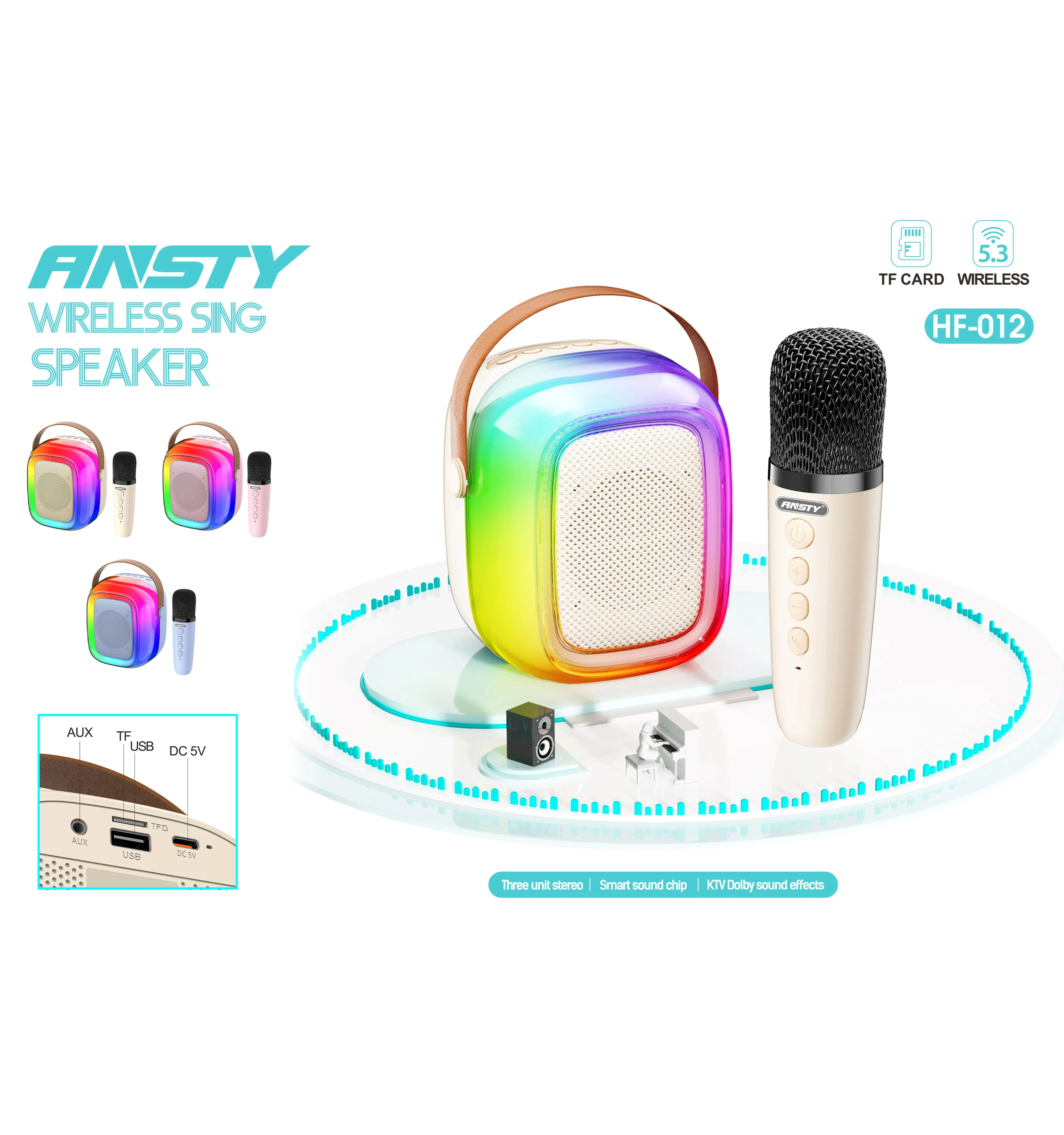 The HF-012 LED Speaker and Mic offers vibrant LED lights, clear sound, and built-in microphone functionality. Perfect for parties or meetings, it delivers both audio and visual excitement in a compact design.