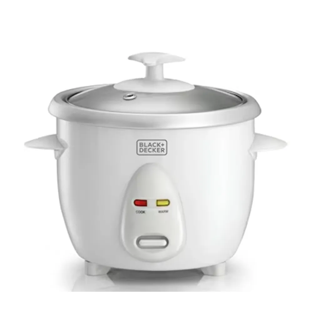 The 0.6 Ltr Rice Cooker (Model RC650-B5) by Black+Decker is a compact and efficient cooking appliance designed for small households, students, and individual use. It features a removable aluminum bowl for easy cleaning and a cook & auto warm function with indicator lights for convenience. The glass lid with cool touch handles ensures safe handling during cooking, while the one-touch button allows simple operation. It also includes a measuring cup and spoon for accurate cooking portions. This rice cooker comes with a 2-year comprehensive warranty (excluding plastic parts).