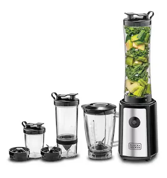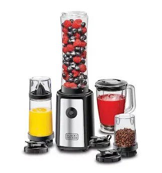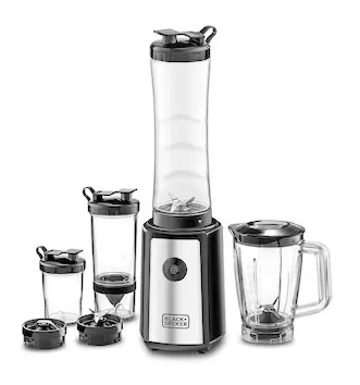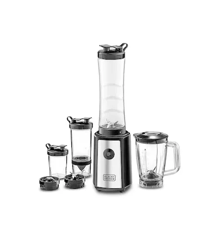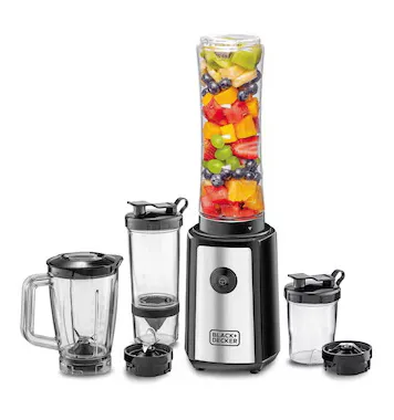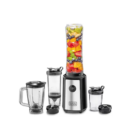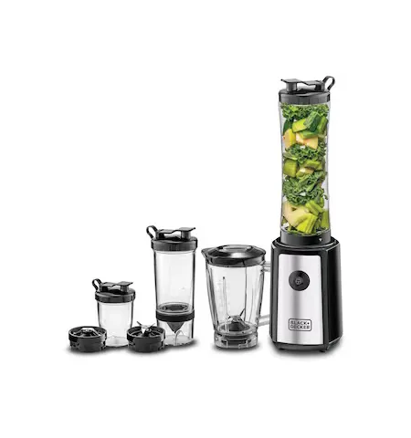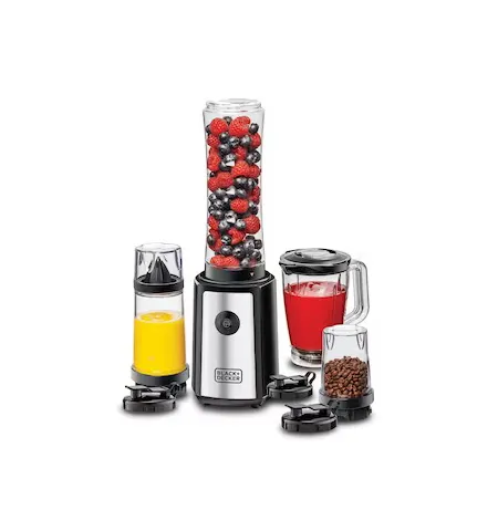The 300W Blender with Mixer Grinder (Model SBX300BCG-B5) by Black+Decker is a compact and powerful kitchen appliance designed for blending, grinding, and juicing tasks. It is equipped with a high-speed 300W motor delivering up to 21,500 RPM for efficient performance. The turbo speed function provides extra power for tough ingredients such as ice and frozen fruits. Stainless steel blades ensure smooth and consistent blending results. The appliance comes as a 16-piece set including multiple jars and bottles for versatile use. With anti-slip feet, dishwasher-safe components, and easy cleaning design, it offers convenience and stability for daily kitchen use. It comes with a 2-year comprehensive warranty.