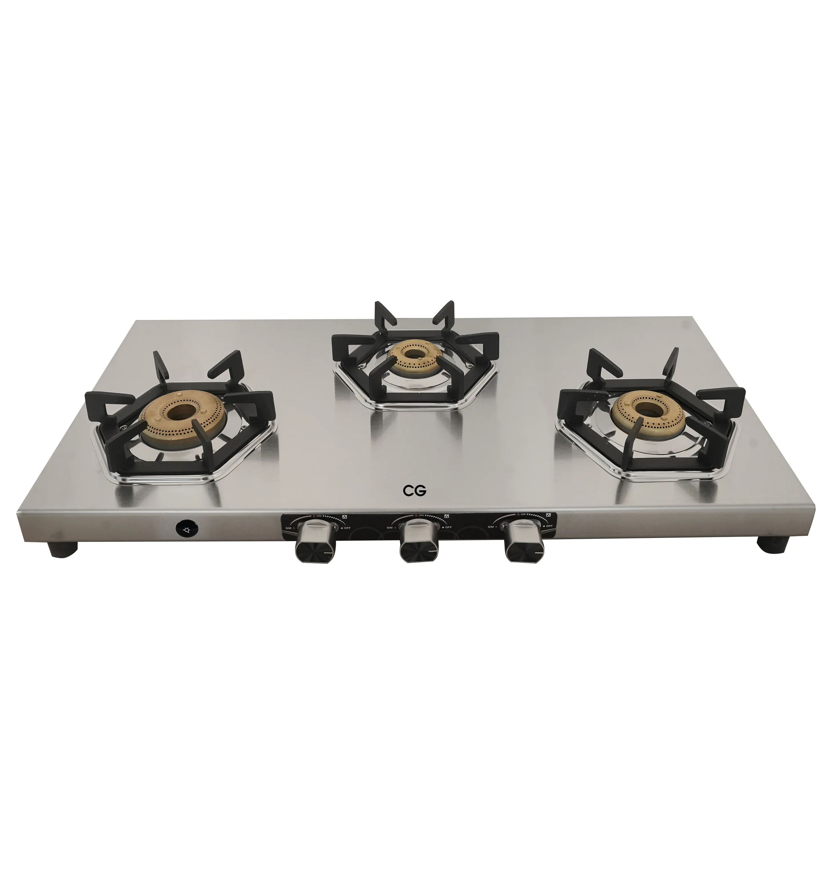This heavy-duty 3 burner gas stove from CG is built for high performance and durability. Featuring forged brass burners, strong pan support, and auto ignition, it ensures efficient cooking while maintaining a robust and premium design for everyday kitchen use.