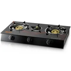 Key Features Triple Burner Design Two large burners and one small burner for versatile cooking (boiling, frying, simmering).  Tempered Glass Top Sleek, heat-resistant black glass surface that is easy to clean and scratch-resistant. Durable Brass...