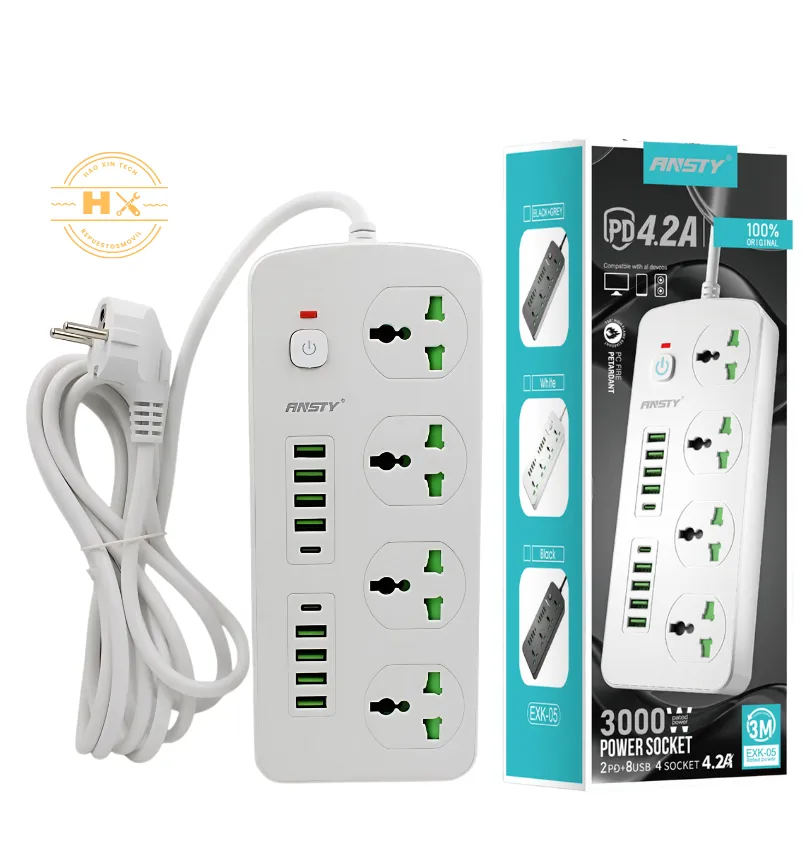 The Ansty EXK-05 (3M) is a versatile and high-capacity power strip extension cord engineered to support the simultaneous use and charging of multiple devices. Designed for convenience and efficiency, it features four AC sockets with a maximum power output of 3000W at 4.2A, making it ideal for powering laptops, desktop computers, home appliances, and more.