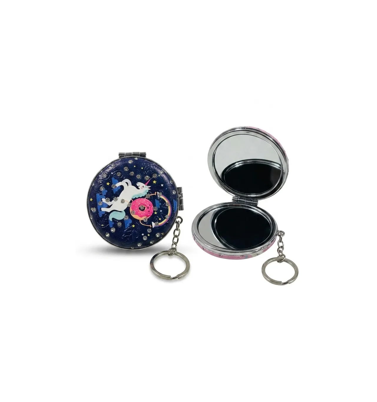 - Design: Features a dark blue outer cover with a colorful unicorn and donut graphic, embellished with small rhinestones.