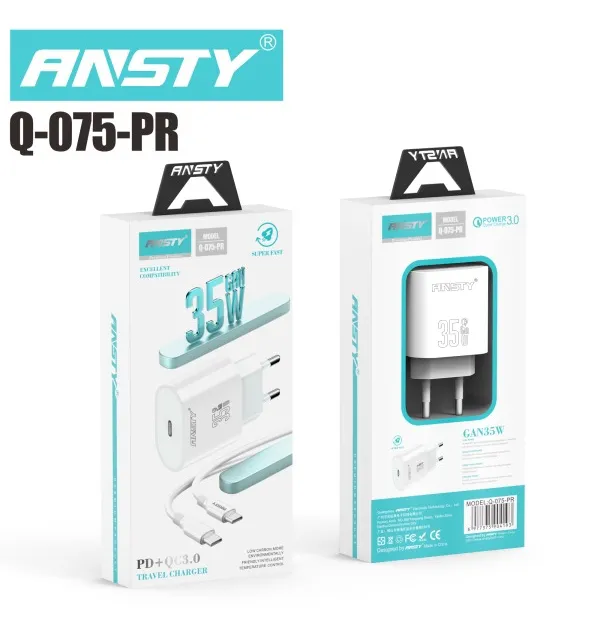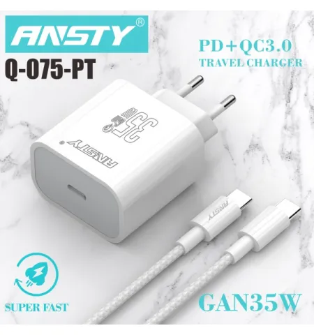 The Q-075-PT GaN 35W charger features USB-C to USB-C fast charging, supports USB PD and PPS, delivers 5V–20V output, compact GaN design, efficient power delivery, and built-in safety protections.