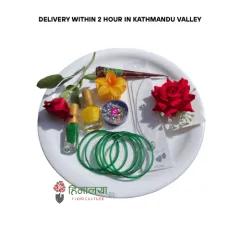 Product Descriptions This combo contains: Chura/Bangles, half dozen (6 pieces) Nail polish, green and yellow (2 pieces) Farm-fresh flower: 1 red rose Rose hair clip, 1 piece Flower clutcher, 1 piece Tika 1 box Mehendi 1 packet Ceramic plate: NO