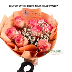 This bouquet contains: Farm Fresh Rose 8 Stems Hybrid Pink Rose Premium Wrapper Cylinder Design