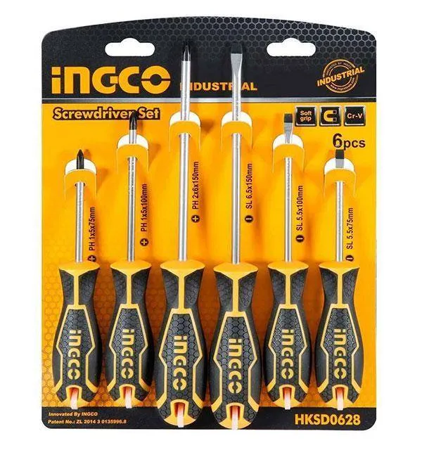 Brand Name:Ingco, Model number: HKSD0628, 1x SL5.5*5*75 mm, 1x SL5.5*5*100 mm, 1x SL6.5*6*150 mm, 1x PH1*5*75 mm, 1x PH1*5*100 mm, 1x PH2*6*150mm, Material: CR-V, Round Blade, Packed in hanger card, FEATURES: Brand: Ingco, Type: Screwdrivers, Color: Black And Yellow