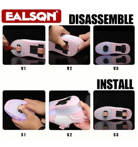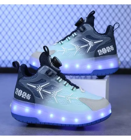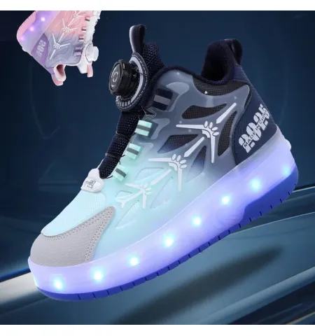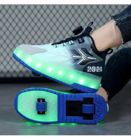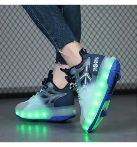 Let your kids shine while they roll! These LED Light Roller Skate Shoes feature two smooth wheels and bright, rechargeable lights that make every step and spin fun and exciting. Made from durable polyester with a breathable lining, these shoes ensure comfort and style for boys and girls alike. The buckle strap closure offers a secure fit, while the EVA outsole provides excellent grip and stability. Perfect for daily wear, outdoor play, and skating fun in all seasons.