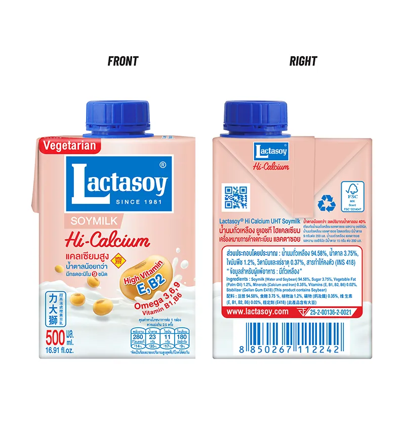 Lactasoy Soymilk Hi-Calcium contains High Level of Calcium and Vitamins together with various healthy minerals from 100% natural soybean but less sugar and Lactose-free. A daily intake of 600 milligrams can provide all the calcium you need.