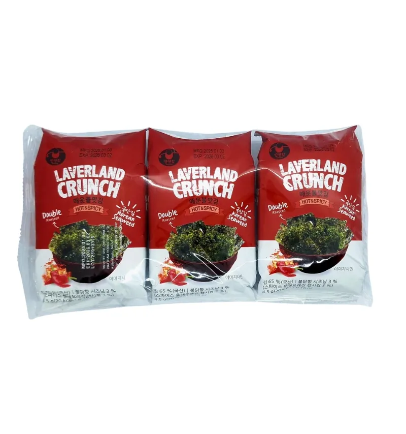 Description: Experience the bold and spicy flavor of wasabi with Laverland Crunch Korean Seaweed. This light and crispy seaweed snack is seasoned with a wasabi kick, offering a unique blend of savory and spicy taste that is perfect for those who enjoy a bit of heat in their snacks.