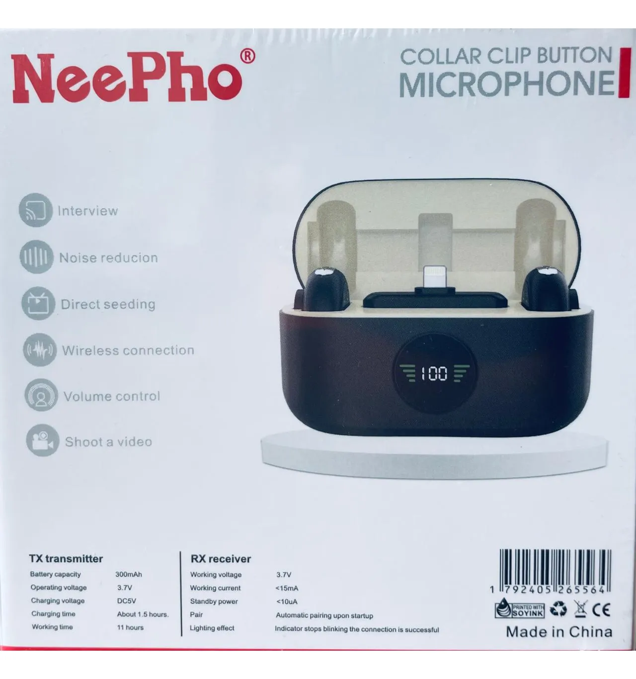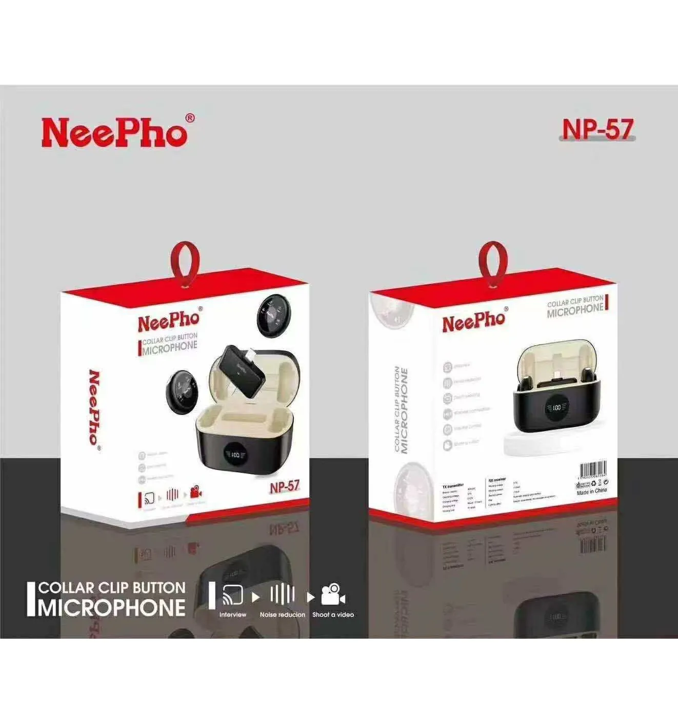 Compact wireless mic set for smartphones. The NP-59 features active noise reduction, volume control, automatic pairing, and a charging case with digital display. Ideal for interviews, vlogging, live streaming, and short video shoots.