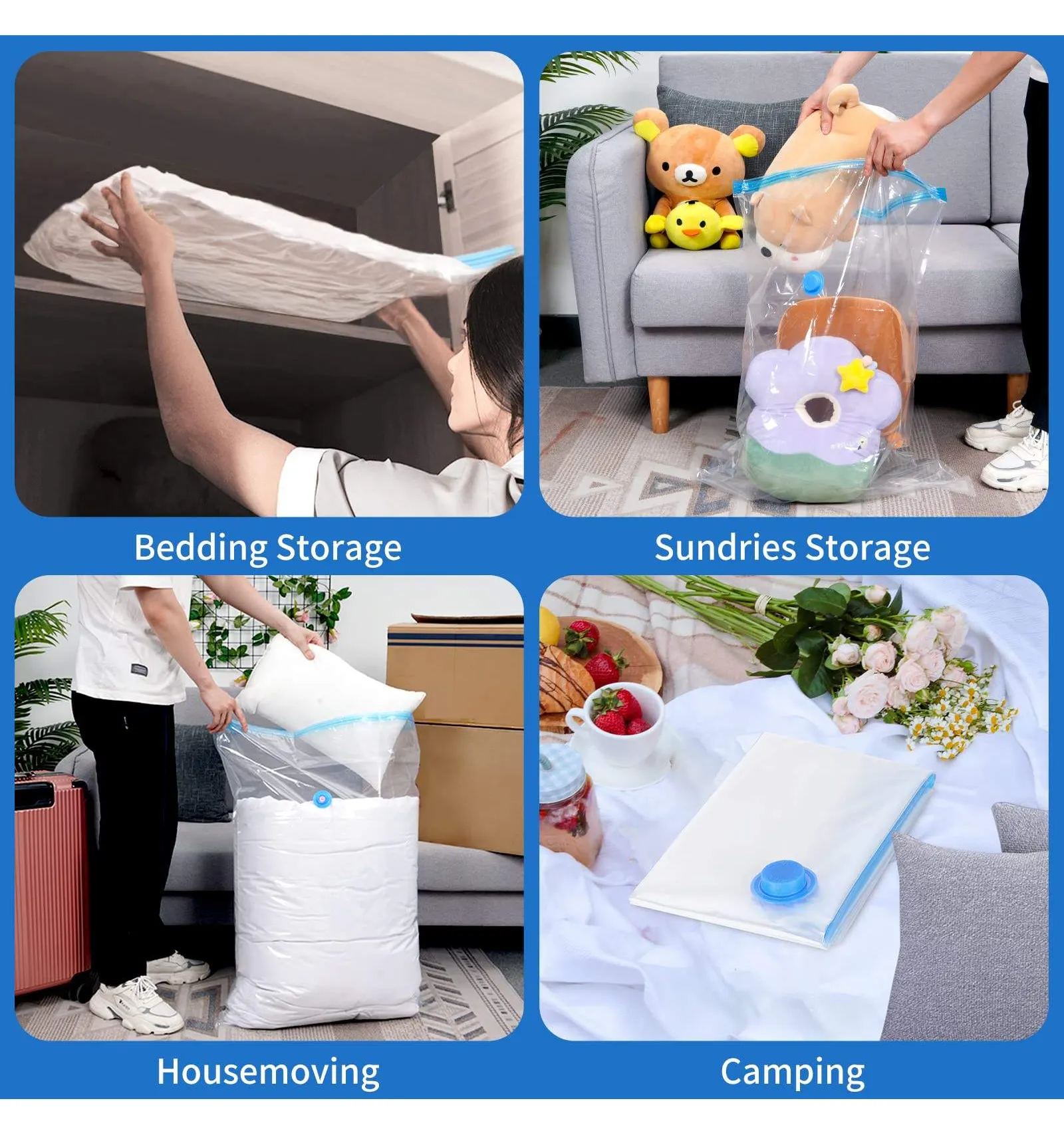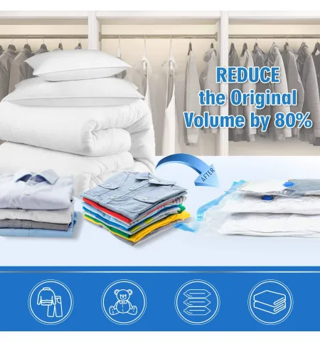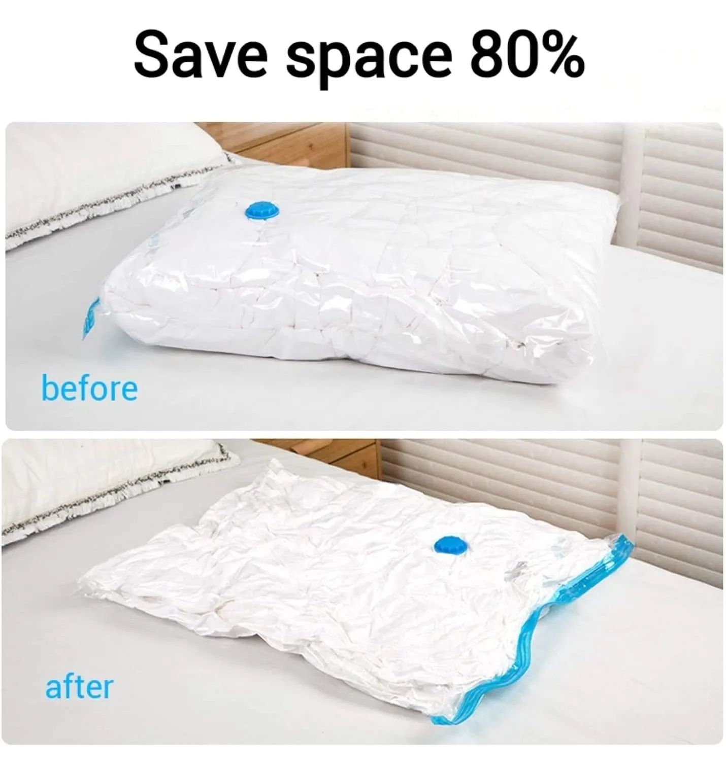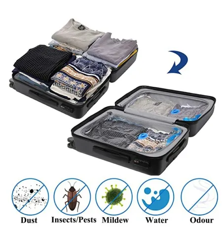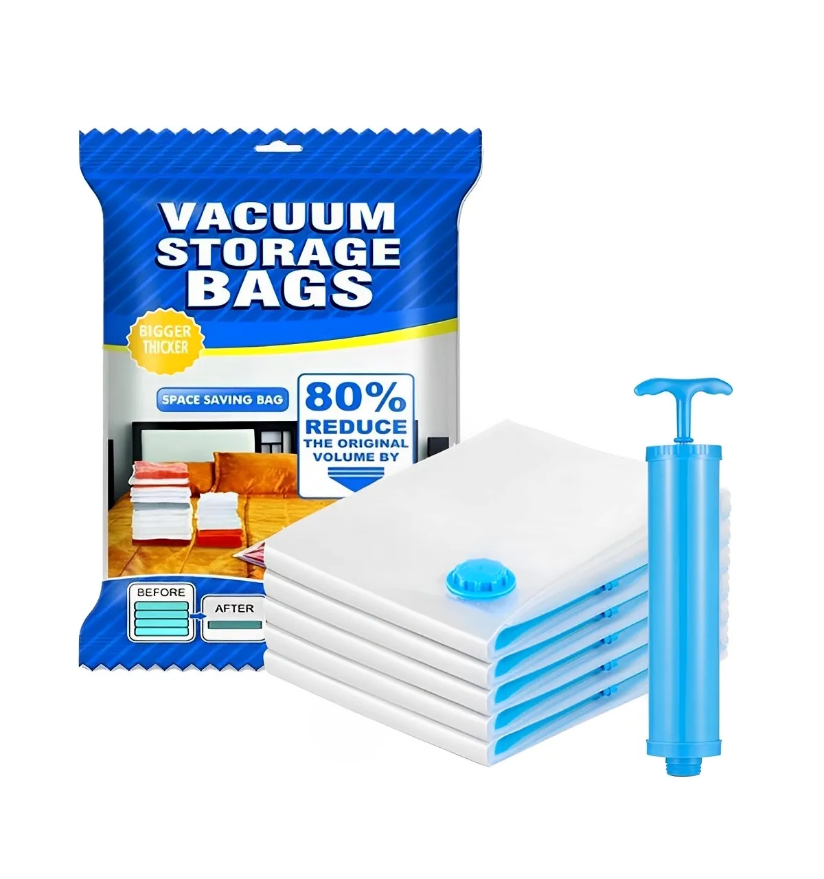 Introducing our Pack of 5 Reusable Zip Lock Vacuum Storage Space Saver Compression Sealer Bags, complete with a convenient Travel Hand Pump. Perfect for clothes and other soft goods, these durable bags efficiently compress and protect your items, maximizing your storage space while keeping them safe from moisture, odors, and dust. Easy to use and ideal for travel, these vacuum bags ensure your belongings stay neat, organized, and ready to go wherever your adventures take you.
