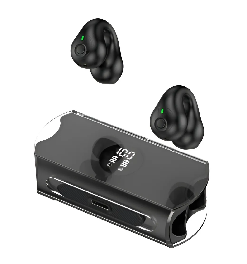 The R19 Earclip Wireless Bluetooth 5.3 earphones feature a transparent spacecraft digital display, not-in-ear design, and ENC noise reduction. They offer a sleek black finish and advanced connectivity for superior sound quality.