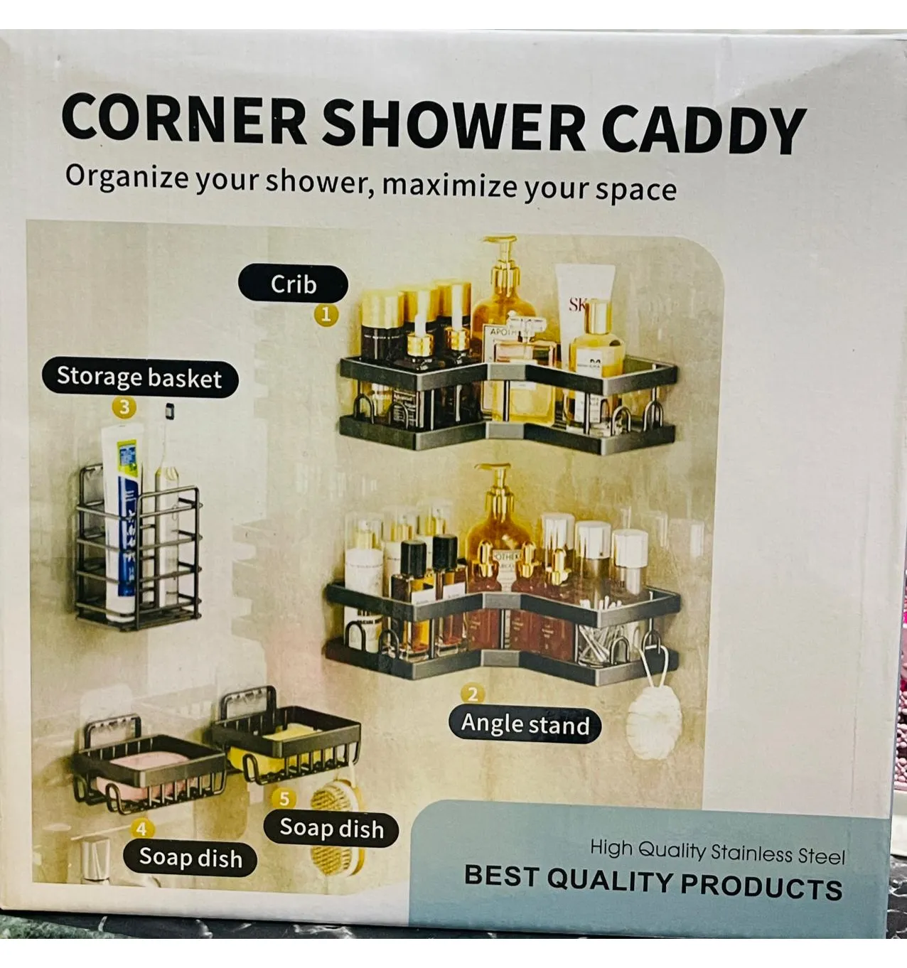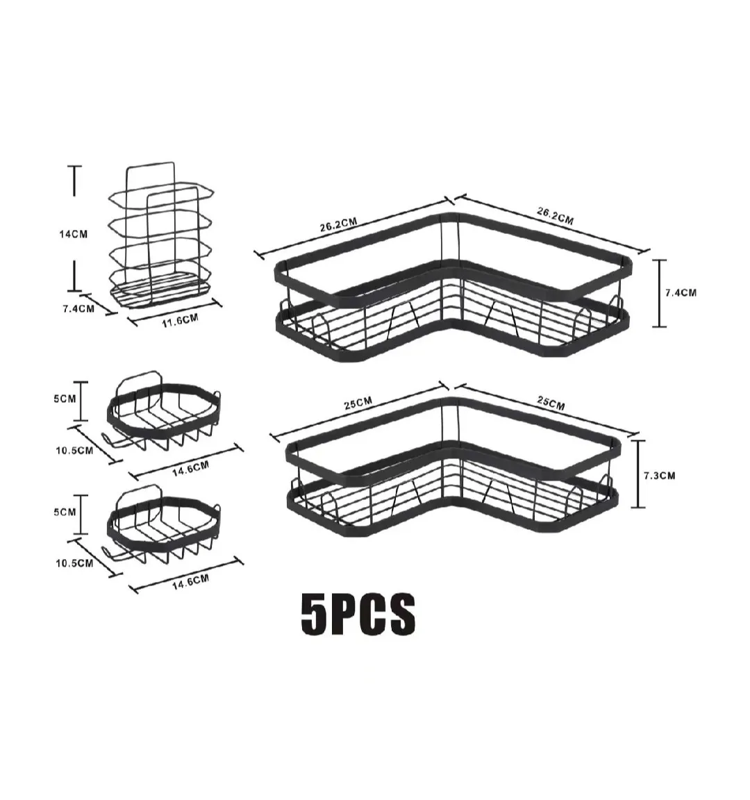 - Includes multiple units: corner shelves, storage basket, and soap dishes