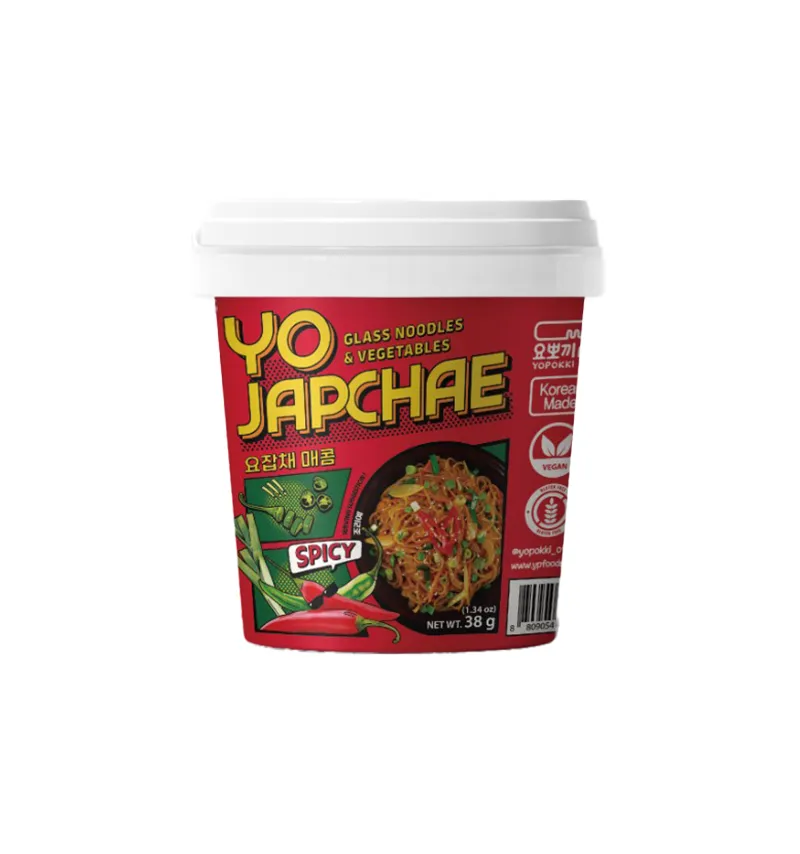 - Yopokki Spicy Japchae are delicious sweet potato glass noodles sautéed with vegetables and a spicy Korean sauce.