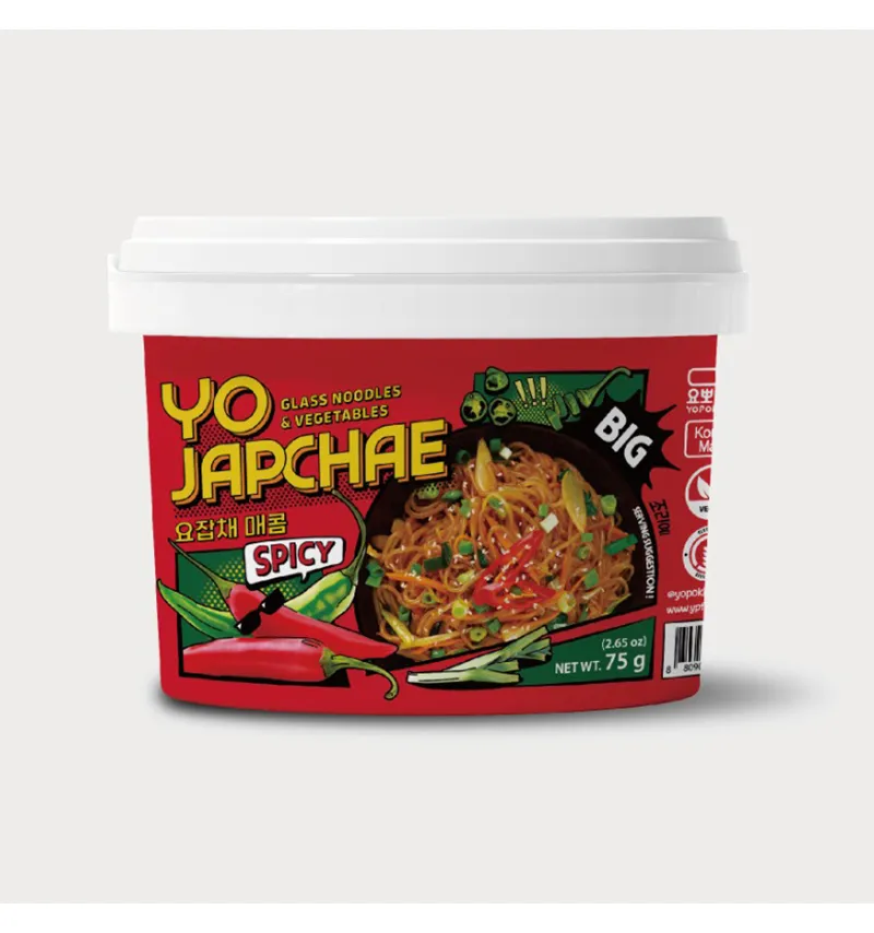 - Yopokki Spicy Japchae are delicious sweet potato glass noodles sautéed with vegetables and a spicy Korean sauce.
