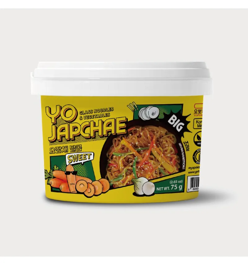 - Yopokki Spicy Japchae are delicious sweet potato glass noodles sautéed with vegetables and a spicy Korean sauce.
